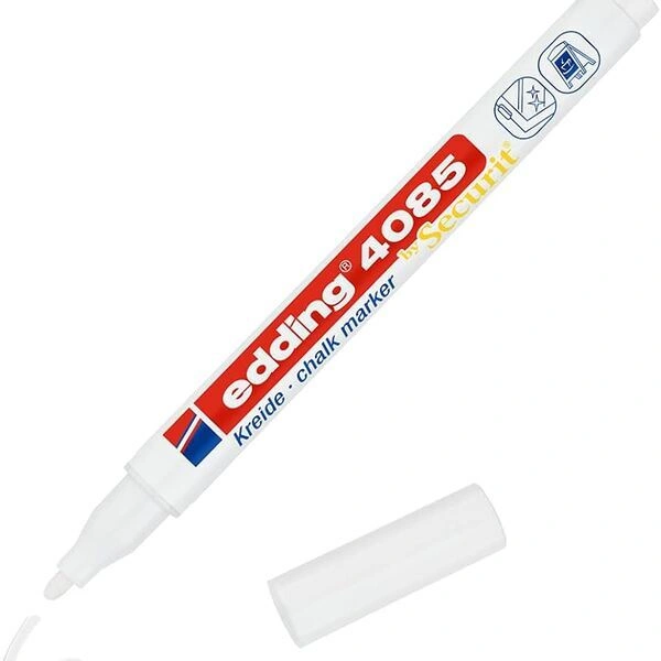 The edding 4085 Chalk Marker in White delivers precise, opaque writing on chalkboards and smooth non-porous surfaces such as glass, windows, mirrors, and acrylic boards. Designed with a fine round nib (1–2 mm), these markers are ideal for detailed lettering, outlines, menus, signage, and creative designs.